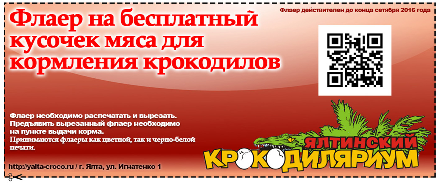 Распечатай флаер с официального сайта Ялтинского Крокодиляриума и получи кусочек мяса для кормления крокодилов во время экскурсии. Корм насаживается на штырек, который ты самостоятельно сможешь протянуть крокодилу, чтоб его покормить. Флаер можно распечатать как в цвете, так и черно-белым. Акция действует в течение двух месяцев - август и сентябрь 2016.